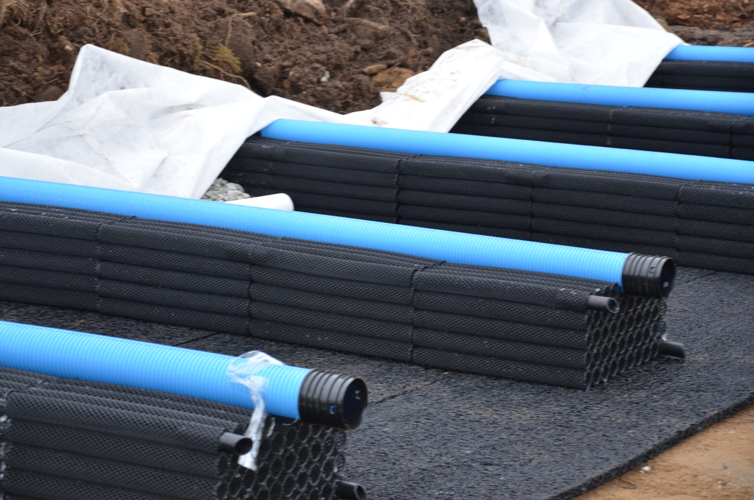 Dräneringsrör under modulerna (vid upphöjd markbädd)