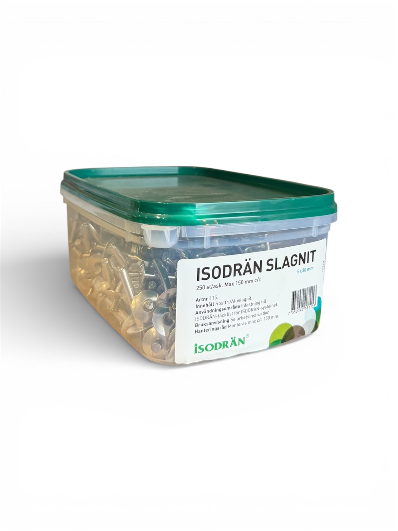 Isodrän slagnit 5×30 mm ger en säker och hållbar infästning av Isodrän täcklist mot grundmur. Niten har ett extra stort huvud som håller listen stabilt på plats utan risk för att den släpper.