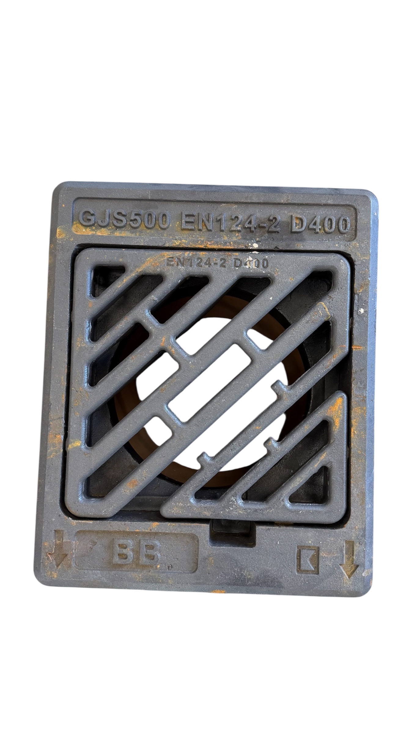 Fyrkantig betäckning i segjärn, körbart med diagonalt gallerlock D400. Monterad på teleskoprör 315 mm.