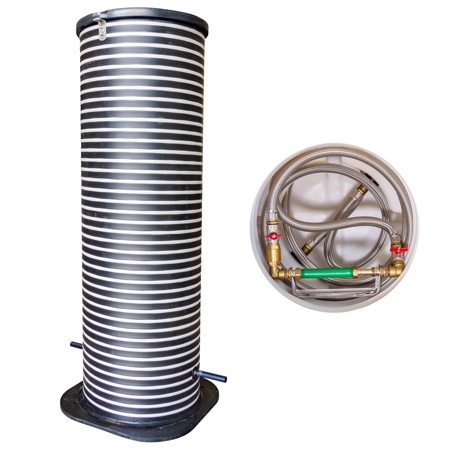 Brunnen tillverkas i dubbelväggigt rör som ger hög stabilitet och lång livslängd. Samtidigt gör de flexibla slangarna att du enkelt lyfter upp hela mätarkonsolen till marknivå. Det förenklar avläsning och service utan att du behöver arbeta nere i brunnen. De roterande kopplingarna minskar belastning på slangar och komponenter. Resultatet blir mindre slitage och trygg drift över tid. En kontrollerbar backventil skyddar dessutom mot återströmning. Kulventiler på båda sidor gör avstängning snabb och enkel vid service.